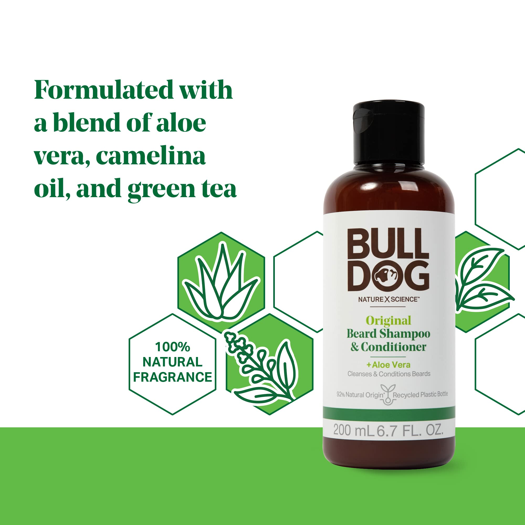 - Q: What are the key ingredients in Bulldog Mens Skincare Original Beard Shampoo and Conditioner? A: The Bulldog Mens Skincare Original Beard Shampoo and Conditioner contains Aloe Vera, Camelina Oil, and green tea. These ingredients are specifically chosen for their cleansing and conditioning properties, ensuring your beard stays soft and nourished.