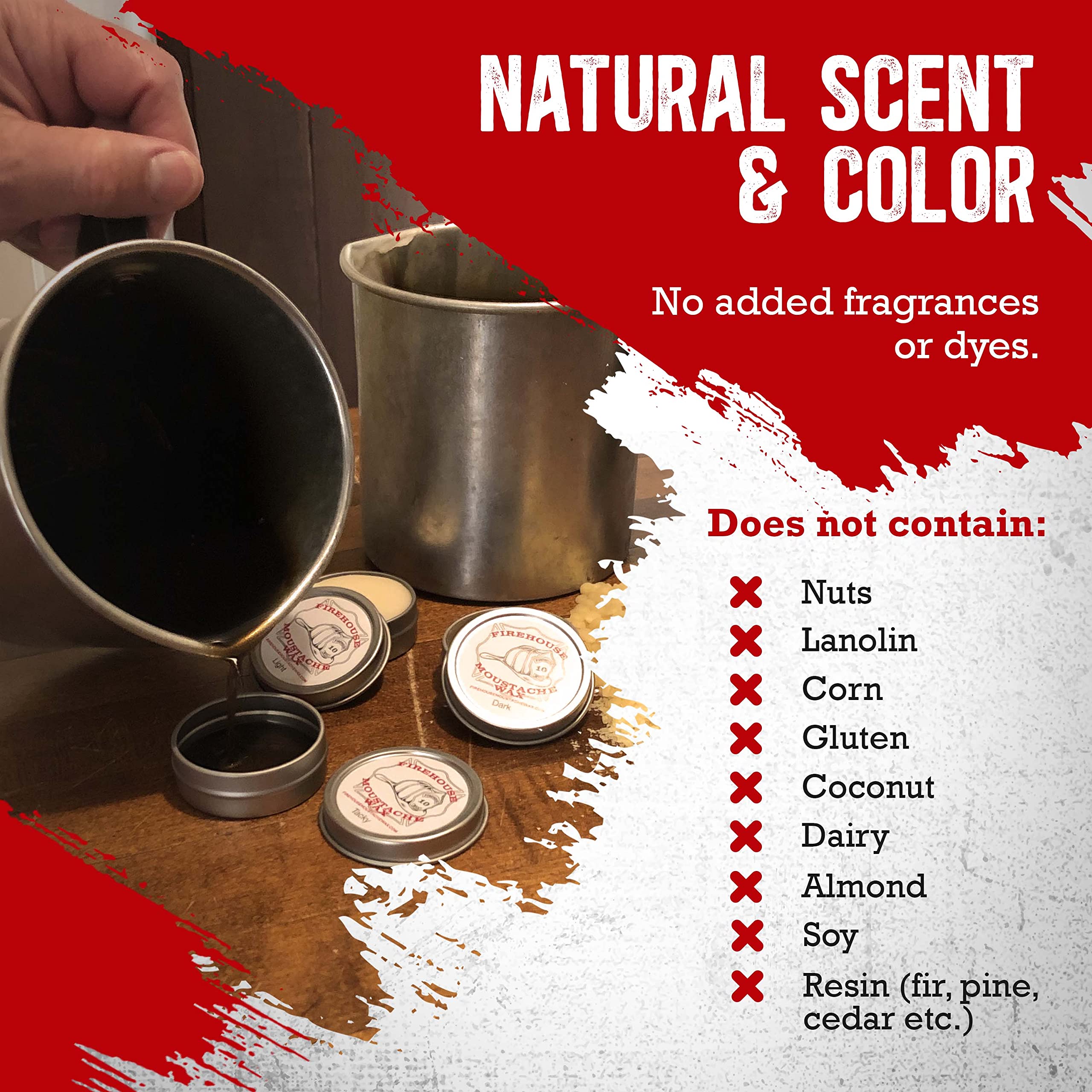 - Q: What are the key ingredients in Firehouse Moustache Wax? A: Firehouse Moustache Wax is made from natural ingredients, including beeswax and a small amount of petroleum, ensuring a strong hold without dyes or fragrances. It is also free from nuts, gluten, and other common allergens.
