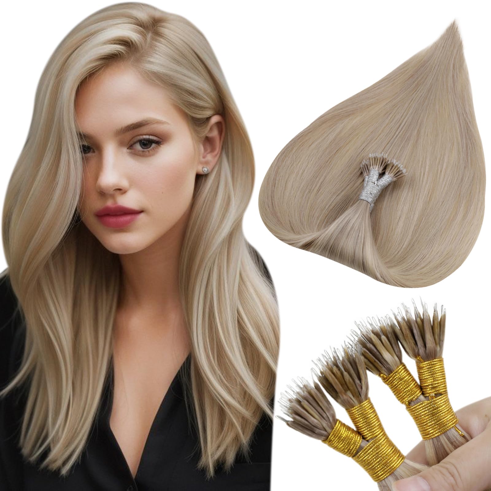 Nano Ring Hair Extensions Nano Ring Hair Extensions, A Kind Of Pre Bonded Fusion Tipped Hair Extensions. Applly Them With Smaller Beads Is More Invisible And Undetectable Methods Of Installation. Why Choose Hetto Nano Hair Extensions: 1.100% Real Human Hair Suits Your Hair Better. 2.No Heat Or Chemicals Are Applied During Installation. Can Be Used With Micro Rings, Will Help Prevent Damage To The Hair. 3.Durable: Up To 3-6 Months Depending On Usage And Care. Specification Hair Color: #18/613 Dark Ash Blonde Highlight Bleach Blonde Hair Weight: 1Gram/Strand, 50Grams Per Pack Hair Material: 100% Real Human Hair Hair Length: 14 - 22 Inch Texture: Natural Straight How To Apply Ring Hair Extensions: 1)Prepare A Needle Hook, Silicone Ring And Fusing Pliers. 2)Part The Hair Into Horizontal Sections. Secure The Higher Section Of Hair With A Clip. The Lower Section Should Begin Where You Wish To Install The Extension. 3)Insert The Pulling Needle Or Hook Through The Ring. 4)Grab A Small Section Of The Hair Near Scalp, Pull The Hair Through Ring With Hook, Holding Ring In Place Approximately 1/2 To 1 Inch From The Scalp. 5)Push A Nano Ring Extension Upward Into The Ring. Squeeze Ring Firmly With Pliers. Let'S Start Your Confidence And Beauty From Hetto Hair!