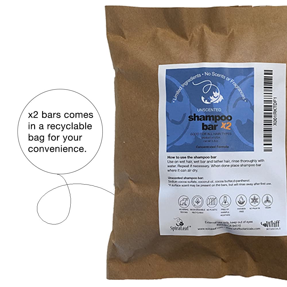 Unscented Shampoo Bar From Spiraleaf Whiff Botanicals Is Made From Just Four Basic Ingredients. Containing No Fragrances, Scents Or Colorings, Unscented Shampoo Bars Provide You With A Rich, Moisturizing Lather That Leaves Your Hair Feeling Clean, Healthy, And Manageable And Looking Great! Most Commercial Shampoos Contain More Than 20 Ingredients, Most Of Which Aren T Commonly Known (And A Few That Should Make You Think Twice About Using Them!). Here At Whiff Botanicals, We Think You Should Be Well-Informed About What You Re Putting In Your Hair And On Your Body. First, Scs Is An Alkaline Foaming Agent That Leaves Hair Feeling Clean Without A Waxy Or Oily Residue. It Makes A Luxurious Foam, It Doesn'T Penetrate Your Skin Like Other Sulfates It Just Attracts Dirt And Oil And Helps Wash Them Down The Drain. Your Unscented Shampoo Bar Generates Foam With Just A Few Swipes Of The Bar Through Your Hands Or Hair. A Little Goes A Long Way, Which Is Why You Can Get Up To 80 Shampoos From A Typical Bar. Second, Unscented Shampoo Bars Have Two Great Natural Oils: Cocoa Butter Helps Control Frizz Some People Even Use It Raw As A Pomade! It'S A Super Moisturizer That Leaves Hair Naturally Shiny And Soft. Coconut Oil Is The Base For This Shampoo Because Its Full Of Fatty Acids And Vitamins That Strengthen, Moisturize, And Make For Healthy, Full-Bodied Hair. Finally, Whiff S Unscented Shampoo Bar Can Be Used With Any Conditioner, Or You Can Rub A Little Coconut Oil Or Cocoa Butter Into Your Hands After Shampooing, And While Your Hair Is Still Wet, Work It Into The Ends, Then Dry. Life S Complicated, But Shampoo Doesn'T Have To Be. Surface Scents May Accure On Bars But Will Not Last After First Use.
