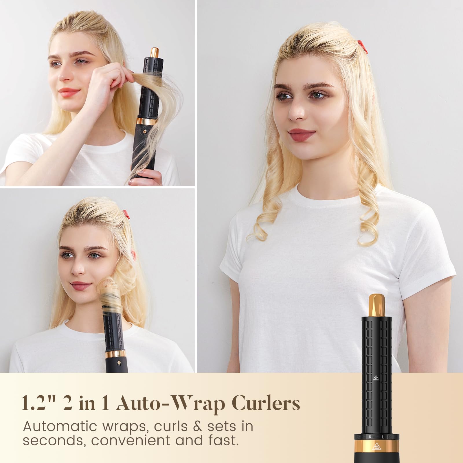 • Q: How does the auto-wrap curler work on this hair styler? A: The 1.2" 2 in 1 Auto-Wrap Curlers use Coanda Technology to create a continuous flow of air that wraps your hair around the curler. This innovative feature allows for quick and effortless curls without the risk of extreme heat damage, ensuring healthy, voluminous curls.