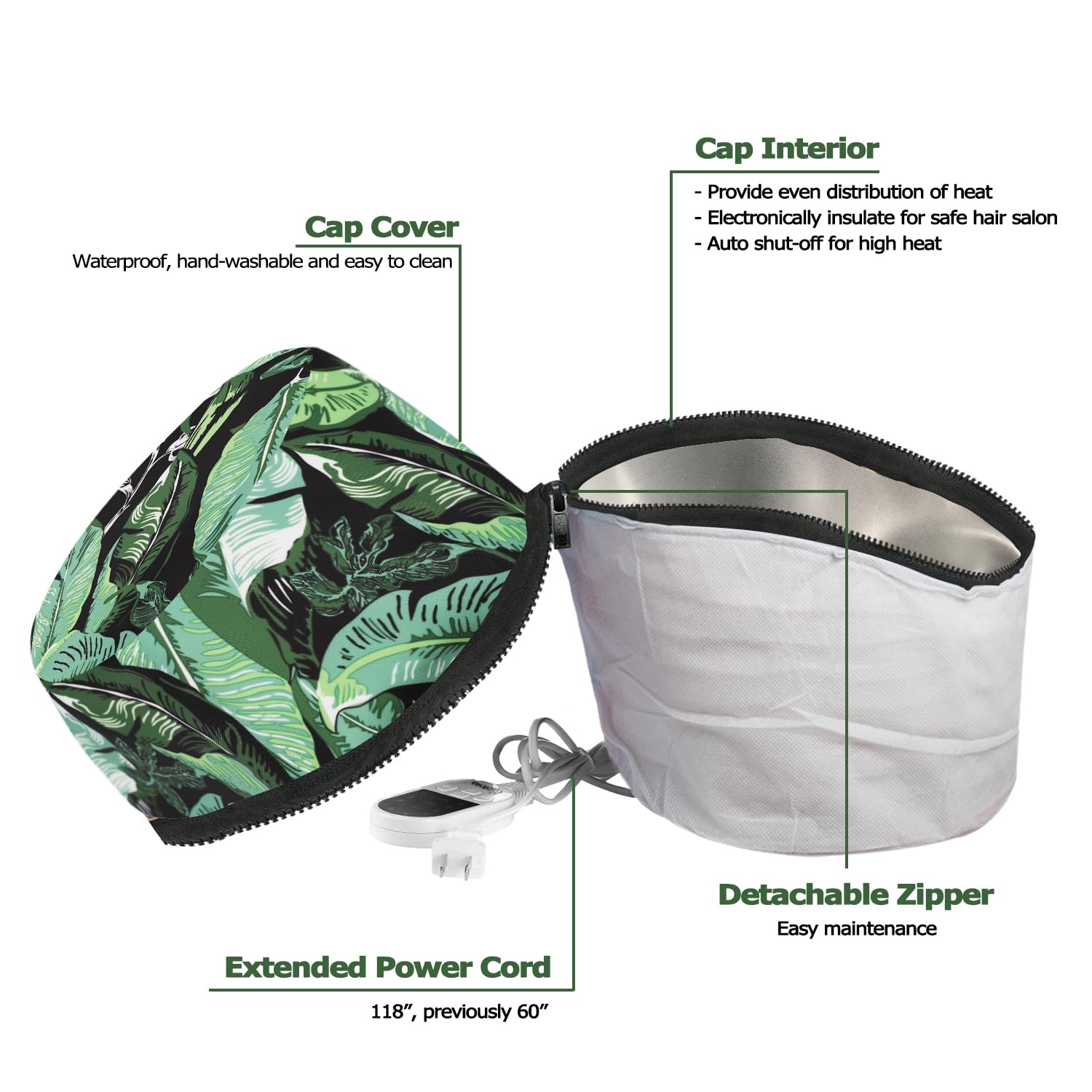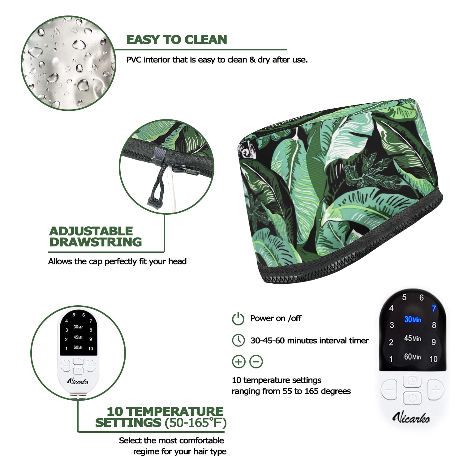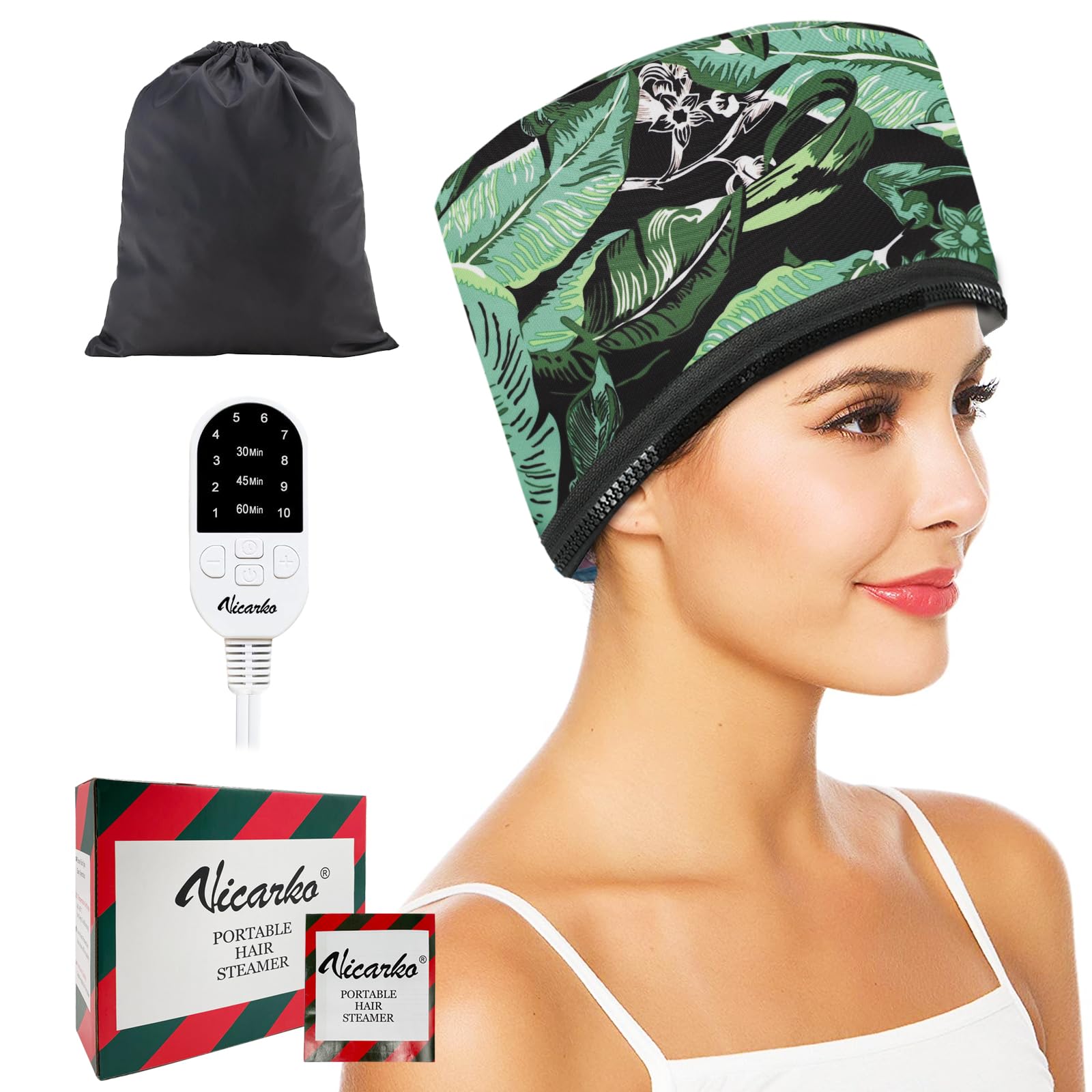 For Oil, Moisture, Or Deep-Conditioning Treatments, Vicarko Hair Steamer Heat Cap Delivers Even Distribution Of Heat And Helps Your Hair Absorb Treatments Quicker And Deeper. Just Plug It In, Adjust The Heat Settings And Enjoy A Home Hair Spa. It Also Supports Heathier-Looking Locks While Protecting From Moisture. Selectable Temperature Settings Can Be Used On Most Hair Types & Textures. Also One Size Fits Most With An Adjustable Drawstring To Perfect Fit Your Head. Features Why A Hair Steamer Cap Applying Heat To Hair And Scalp Opens Pores And Hair Cuticles. It Also Enhances The Benefits Of Favorite Hair Treatments To Leave Hair Smooth & Shiny. One Size Fits Most Wide & Deep Cap Ensures You Easily Cover 360 Of Your Head. You May Also Adjust The Cap To Fit Your Head Perfectly With A Head Strap At The Back. For Most Hair Types & Textures 10 Temperature Settings Ranging From 55 To 165 Degrees Precisely Control The Level Of Heat. It Allows You Pick The Right Temperature For Your Hair Type. Automatically Shuts Off With A Timer. Lightweight, Portable & Comfortable Lightweight & Portable Compared With An Old And Heavy Hooded-Dryer, The Steamer Cap Is Much More Convenient To Use. It Heats Up Fast And Consistently, Thanks To Multiple Heating Zones. You Will Have The Flexibility Of Relaxing On The Couch Or In Bed With The 118 Power Cord And Lightweight Design Of The Cap. Also Compact Enough To Store Easily With A Dust Bag Comes With. Extended Power Cord & Stylish Mailer Box You Will Have The Flexibility Of Relaxing On The Couch Or In Bed With The 118 Power Cord And Lightweight Design Of The Cap. It Comes A Colorful Cardboard Mailing Box With Holiday Prints, A Matching Dust Bag, And A User Manual For Quick Start. Easy Maintenance Inside Lining Of The Cap Is Easy Wipe-Down & Water-Resistant. Optional Use With A Disposable Shower Cap May Protect The Hair Steamer Cap From Hair Treatment Residue.