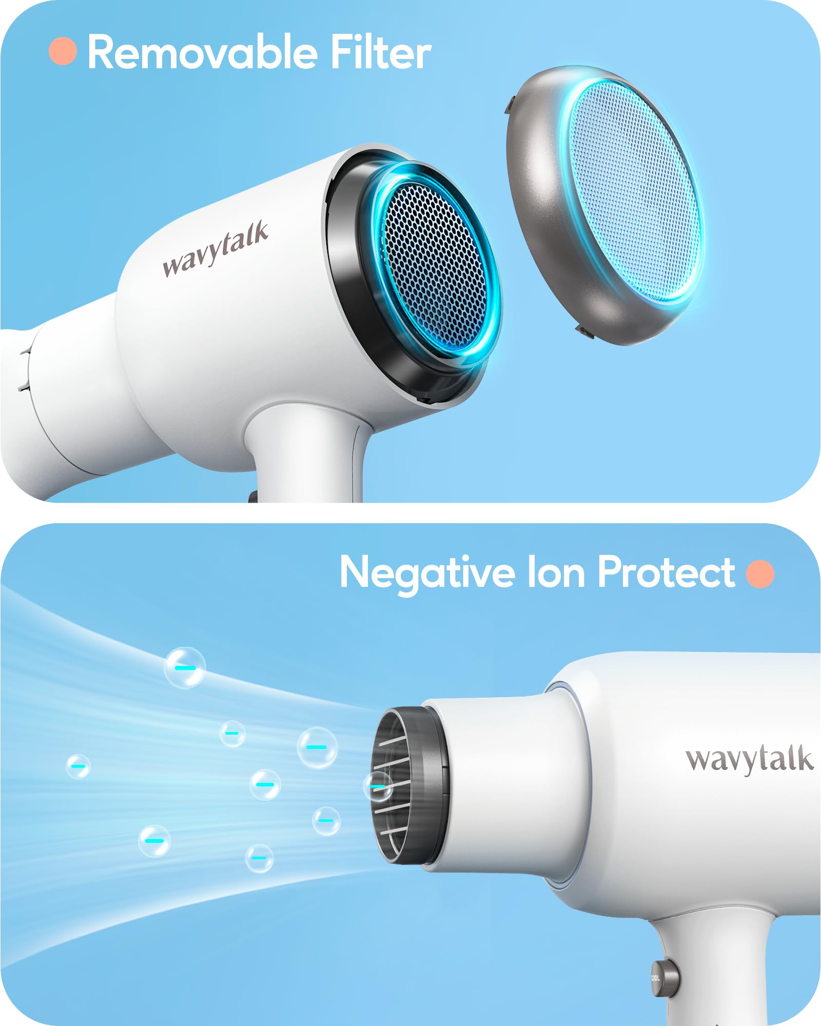 3 Attachments For All Hair Types: Nozzle Concentrates And Directs Airflow, Ideal For Precision Styling; Diffuser Disperses Airflow Evenly, Reduces Frizz, And Is Suitable For Curly Or Wavy Hair; Comb Helps To Straighten The Hair, Particularly Beneficial For Thick Or Unruly Hair | 1875 Watt Powerful Motor For 2X Faster Blowdry: Wavytalk Hair Dryer Is Equipped With An Efficient Motor And Advanced Internal Aerodynamics That Ensure Strong And Steady Airflow. Paired With The Constant Heat, It Drastically Cuts Blowdry Time By Speeding Up The Evaporating Process. Faster Drying Means Time-Saving And Less Damage To Your Hair | Compact Design: The Hairdryer Boasts A Compact Size And Lightweight Construction, While Its Polished Metallic Surface Or Matte Texture Adds A Touch Of Finesse To The Overall Design. Furthermore, The Blowdryer Enhances The Ergonomic Grip, Ensuring Comfortable Usage And Preventing Accidental Button Presses. This Hair Dryer Equipped With A High-Density Dust Screen Inside, Which Can Effectively Prevent Hair From Being Sucked In | Safety Protection&Low Radiation: The Blow Dryer For Natural Hair Will Automatically Shut Down When The Temperature Is Too High, It Will Avoid Fire Hazards If You Forget To Turn Off The Ionic Dryer After Using Or If The Blowing-Dryer Is Covered By Cloth Or Papers When It Is Working. Adopting Low Magnetic Wave Construction Technology Helps Reduce Electromagnetic Field Radiation By More 50% Than Other General 1400-1600W Hairdryers, Friendly To Pregnant Women And Children | Constant But Not Extreme Temperature: This 1875 Watt Hairdryer Takes Control With 3 Temperature Settings, 2 Airflow Speeds Including A Cool Shot. (Press And Hold The Cold Air Button To Release Cold Air. Release The Button To Restore The Previous Temperature. ) The Variable Settings Are Designed For Customizing Heat And Airflow As You Like And For Flexibility Of Use And Salon-Quality Results